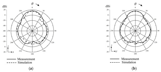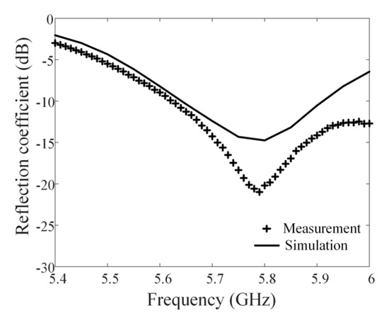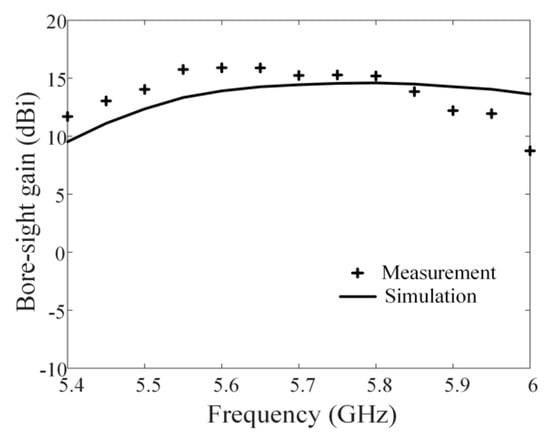 Figure 7 shows the measured and simulated reflection coefficients of the proposed antenna element. The solid line and “+” symbol indicate the simulation and the measurement, respectively. The simulated value of −15.3 dB is in good agreement with the measured value of −23.2 dB at 5.8 GHz. The measured and simulated bore-sight gains are 15.2 dBi and 14.5 dBi at 5.8 GHz, respectively, and they are greater than 8 dBi over the entire range of 5.4–6 GHz, as shown in Figure 8. This result indicates that the gain is improved 6.6 dB over the patch antenna without shorting pins. There is some discrepancy between simulation and measurement, which is due to slight variations in the effective dielectric constant and manufacturing errors of the thick superstrate.