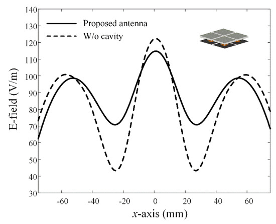 Figure 10c shows the aperture efficiency according to the distance d2 between adjacent elements at 5.8 GHz. The solid line and dashed line indicate the aperture efficiencies with and without the extended cavity structure, respectively. The maximum aperture efficiencies with and without the cavity structure are 74.2% (d2 = 7.5 mm) and 61.2% (d2 = 2.5 mm), respectively. Additionally, the maximum aperture efficiency of the array without shorting pins is 22.05% (d2 = 0 mm). To analyze the effectiveness of the proposed extended cavity structure, we observe the E-field distributions (Ey) on the 2 × 2 array surface (−75 mm ≤ x, y ≤ 75 mm) at z = 57.6 mm with and without the cavity, as shown in Figure 11. The variance value is then calculated from the E-field distributions when an input power of 1 W is used. The variance of the proposed array is 163.6, which is 334.9 lower than the variance of 498.5 without the extended cavity structure. The results demonstrate that the extended cavity structure can lead to more uniform E-field distributions, which can improve aperture efficiency.