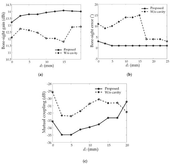 Effect of the extended cavity structure: (a) Bore-sight gain according to d2, (b) error in the bore-sight direction depending on d2, and (c) mutual couplings according to d2.
