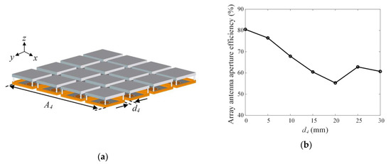 The 4 × 4 array and aperture efficiency: (a) Geometry of the 4 × 4 array and (b) aperture efficiency according to d4.