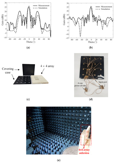 Measured and simulated radiation patterns: (a) zx-plane, (b) zy-plane, (c) fabricated array antenna, (d) feeding network, and (e) measurement setup in a full-anechoic chamber.