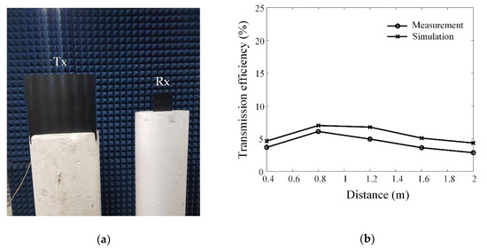 Transmission efficiency: (a) Setup using the proposed antennas and (b) comparison of the simulated and measured transmission efficiencies.