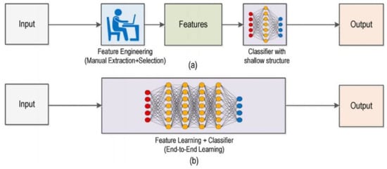 Comparison between traditional machine learning models (a) requiring manual feature extraction, and modern deep learning structures (b) which can automate all the feature and training process in an end-to-end learning structure.