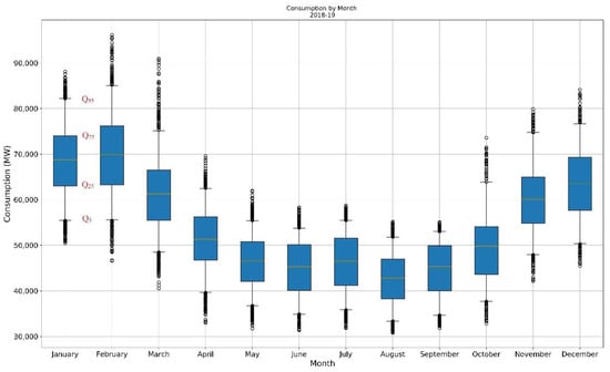 Monthly French energy demand for the period 2018–2019. Qx indicates the X data percentiles. The colored lines within the Q25 and Q75 quartile boxes represent the median (orange line) and the mean (dashed green line). Points below and above Q25 and Q75 are shown as well.