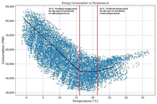 As explained in [19], the meteorological parameters are the most important independent variables and the main form of input information for the forecast of energy demand. Specifically, temperature plays a fundamental role in the energy demand prediction, since it has a significant and direct effect on energy consumption (please refer to Figure 3). Moreover, different weather parameters are correlated, so the inclusion of more than one may cause multicollinearity [19]. Accordingly, for this paper, temperature was the fundamental input used.