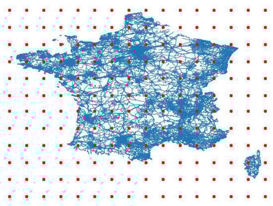 Although ARPEGE provided multiple forecast data related to weather (pressure, wind, temperature, humidity) with a full resolution of 0.1°, the authors of this paper found that the temperature data with a 1° resolution (as shown in Figure 4) were sufficient for the purpose of energy demand forecasting while maintaining easy-to-handle data sets. This finding is also aligned with the strong correlation of energy demand and temperature described in the preceding Section 2.1.1. Figure 4 shows the pre-processing results after reducing the granularity of the grid from 0.1° to 1°.