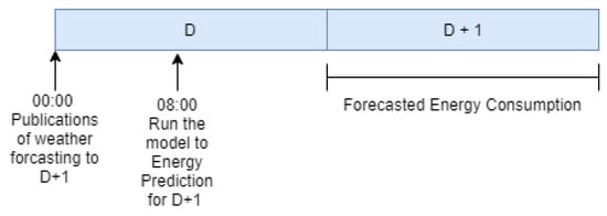 As depicted in Figure 5, the power demand forecast model was run at 08.00 every day (D), with the most recent weather forecast information available (released at 00.00), and provided a prediction of the energy demand during day D+1.