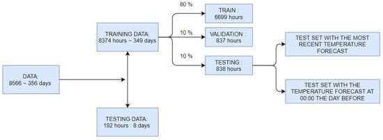 Division of the original dataset (365 days) into testing and training data. The testing data were used as a complementary means to further analyze the generalization performance of the resulting model. The remaining training data were divided as usual: 80% train, 10% validation, and 10% testing.