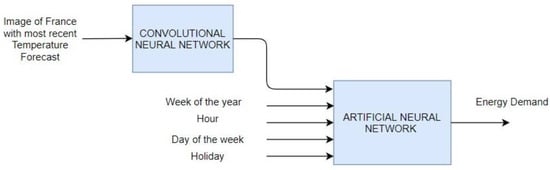As shown in Figure 7, the artificial neural network receiving the “featured” temperature from the convolutional network was also fed with additional information found to highly influence the energy demand as well, namely: