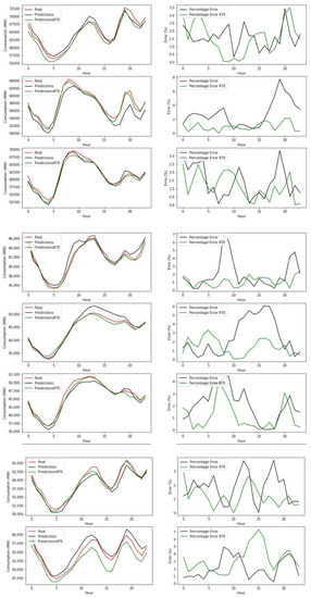 The proposed deep neural network also was tested against eight full days randomly selected from the original dataset in order to provide an additional measure of generalization performance. On the one hand and as shown in Figure 10, the errors were uniformly distributed along the selected days. On the other hand, the predictions provided by this paper were quite similar to those predictions provided by the reference RTE subscription service and were also aligned with the overall MAPE metrics. These results indicate that the proposed neural network structure is well designed and trained, and that it generalizes as expected.