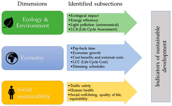 Overview of the dimensions and hitherto identified subsections in the framework of indicators of sustainable development for exterior lighting [18].