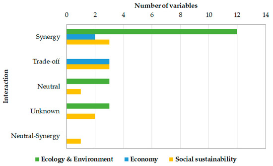 Interactions between sustainable development variables and energy performance divided into the three sustainability dimensions. N = 33 (Ecology & Environment N = 18; Economy N = 5; Social sustainability N = 10).