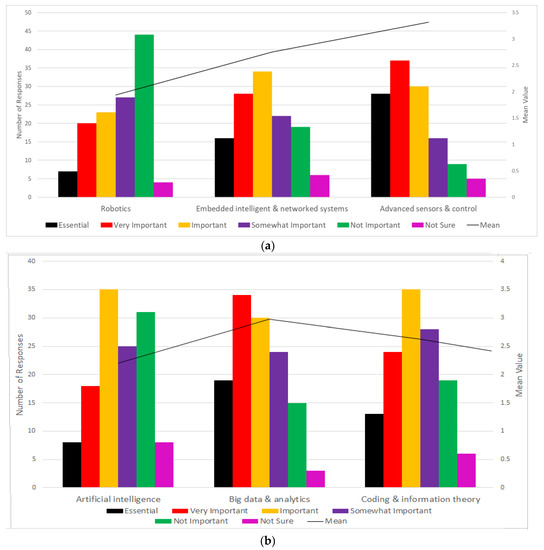 In order to establish the priority technical curriculum subjects, topics highlighted in the interviews were included in the wider online industry survey to generate more robust data, as shown in Figure 7a–c.