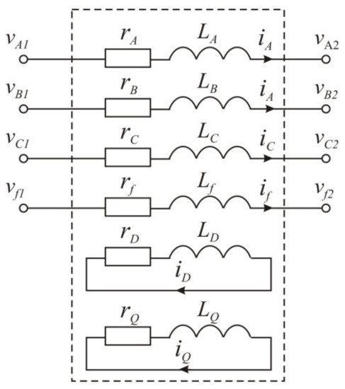 Equation (23) is an algebraic equation used for the determination of the internal circuit’s current in the integration step. Equation (22) using Equation (23) is written as Equation (14) for a synchronous machine: