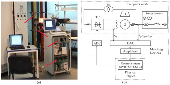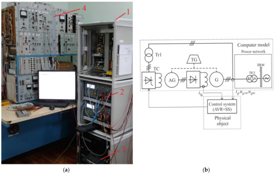 Appearance (a) and functional scheme (b) of the hybrid model for a power generation system with a brushless excitation system for the turbogenerator. 1: computer model of power scheme, 2: matching elements (amplifiers), 3: industrial computer, 4: excitation controller.