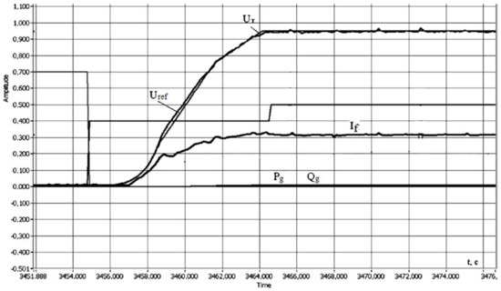 The oscillogram obtained for the mode of the generator’s reactive power regulation by changing the generator’s voltage setting on the physical excitation system is shown in Figure 5.