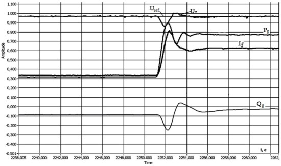 The research results for the case of an abrupt loading of the generator by active power are shown in Figure 4. Under this loading, there was a dynamic drop of voltage by 0.1 nominal value. These experiments made it possible to adjust the generator control system.