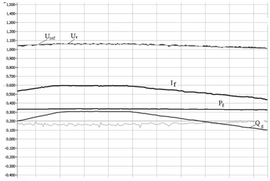 The research results in the form of the experimental oscillograms of the generator excitation current If, the effective value of the generator terminal voltage UT, the reference value of the generator terminal voltage Uref, and the active and reactive power at the generator’s output Pg, Qg are shown in Figure 3, Figure 4 and Figure 5. Oscillograms were derived from the physical excitation system co-operating with the excitation system’s software. All values on the oscillograms are given in relative units.