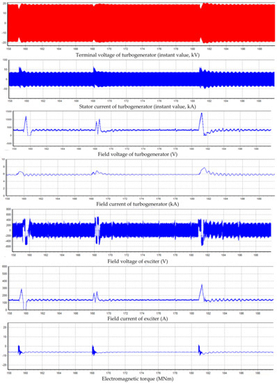The oscillogram for the mode of the repeated short circuits (one and two-phase) in the power network, which are obtained in the hybrid model (Figure 6) with the physical excitation controller of the turbogenerator, which is operated at the South-Ukrainian Nuclear Power Plant, is shown in Figure 7.