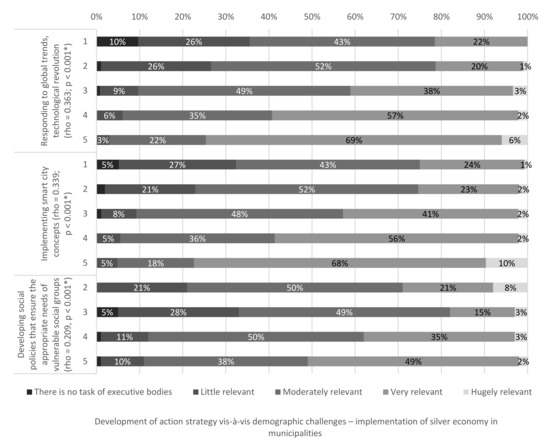 Additionally, when it comes to the development and implementation of the action strategy addressing demographic and silver economy challenges, a positive and significant correlation was observed: the higher perception of the importance of co-creation, the higher relevance is attributed to the policy and measures adopted in response to the ageing population (p < 0.001*, Table 6). The great relevance of this task was recognized and acknowledged practically only by those heads of villages and mayors who see residents’ involvement as hugely relevant. In addition, the ‘very relevant’ answer was more often given by heads of villages/mayors who show higher appreciation to the participation of residents. Moreover, it is more visible with regard to the inclusion of residents who are socially excluded or threatened with social exclusion (rho = 0.182—Table 6).