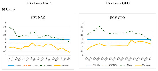 In the case of China, the effect of NAR returns was significant for all lower, middle, and upper quantiles of the provisional distribution of EGY. The effect became strong and more significant in the lower quantiles with the t-stat value of approximately 3.4. The current study observed no causal effect of returns of NAR on the volatility of EGY in the case of the China. Moreover, the causal effect on volatility was not asymmetric, because they were insignificant for the upper, middle, and lower quantiles of the conditional distribution. On the other hand, the effect of GLO returns was also significant for all quantiles of distribution on the returns of EGY. The effect became more noteworthy in the low quantiles with the t-stats coefficient of approximately 3.56. However, the current research found no causal connection between returns of GLO and volatility of EGY. Put simply, the findings confirmed that returns of NAR and GLO had a significant causal impact on the returns of EGY at all quantiles.