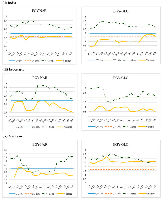 In the situation of India, the impact of NAR returns was noteworthy for all quantiles of the returns of EGY. Moreover, the impact was strong and more significant at lower and middle quantiles of the returns of EGY. However, the present research did not find any causal effect of NAR returns on the volatility of EGY. In addition, the effect of returns of GLO was significant on the returns of EGY, however, the effect of the returns of GLO was significant on the volatility of EGY only at the upper quantiles at the 10% level of significance. In general, the returns of NAR and GLO had significant causal impact on the returns of EGY across all quantiles. The findings of causality from NAR and GLO to EGY are very interesting in the case of Indonesia. The findings confirmed that the returns of NAR had causal impact on the return and volatility of EGY at lower to middle quantiles. On the other hand, the influence of returns of GLO had a causal impact on the returns of EGY but there was no evidence of a causality from returns of GLO to volatility of EGY in Indonesia. In the case of Malaysia, the effect of NAR returns was substantial on the returns of EGY only at the extreme quantiles (i.e., lower and upper). However, the returns of NAR had a significant causal impact on the volatility of EGY on the lower middle quantiles. On the other hand, the effect of GLO returns had a significant causal impact on the returns and volatility of EGY. Put simply, the returns of NAR had a causal impact on EGY returns only, whereas the returns of GLO had a causal connection with EGY returns and volatility. In the case of Thailand, the returns of NAR were significant for all quantiles of returns of EGY. Moreover, the effect was strong and more prominent at both extreme quantiles (i.e., lower and higher). However, the study found no causal connection between the returns of NAR and volatility of EGY. On the other hand, the effect of GLO on EGY returns was significant across all quantiles of distribution. The effect was more powerful at the lower middle quantiles. In addition, the study found no causal impact of GLO returns on the volatility of EGY in Thailand.