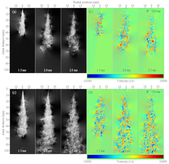 The effects of injection pressure on the spray flow at the back pressures of 10 and 50 bar are shown in Figure 15 and Figure 16, respectively. As can be seen from the time-resolved spatial distribution of the vector and vorticity, the spray at 2.5 ms ASOI shows more large- and small-scale vortexes than at 2.0 ms ASOI, which had shown a larger vortex distribution than at 1.5 ms. At the earlier injection timing, the surrounding/ambient gas was not perturbed by the injected spray, which means there were fewer fuel-air interfaces and interactions.