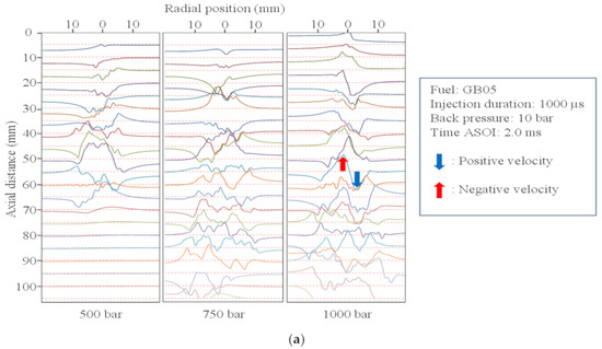 In Figure 17, when the injection pressure increases, the axial velocity profile calculated at the time of 2.0 ms ASOI presents its first negative value when the spray distance is shorter than those of the low injection pressure. At the injection pressure of 500 bar, the negative velocity is first seen at 35 mm from the injector tip, while the injection pressure of 750 bar indicates negative axial velocity at 25 mm. Particularly, the injection pressure of 1000 bar shows the radial flow field of the spray at 5 mm, which is the shortest distance plane from the tip that was analyzed. The droplet size of the spray decreases as the injection pressure increases, due to the high shear rate. Therefore, air entrainment could exist earlier in the entrainment section and might attempt to bend the spray to the radial direction, thus creating the vortex motion. At longer spray distances, the negative axial velocity distributed along the radial direction corresponds with the higher number of the vortexes created throughout the spray.