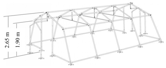 The virtual model reproducing the existing base camp (baseline) was sized for accommodating 150-persons and included 15 accommodations, each hosting 10 persons, 15 ablutions, administration, maintenance, laundry and storage hangar, kitchen, and dining facilities (Table 1). Each accommodation tent was 5.80 m length and 5.10 m width, with a medium internal height of 2.30 m. Data have been obtained in line with the technical sheet of the model by Montana 29 tent, Ferrino (Figure 2). The relative U-values of the envelope reported in Table 2 were estimated assuming that the standard shelter system was a canvas tent with low thermal resistance, in agreement with the literature [19].