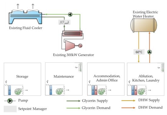 Figure 3 shows the detailed HVAC system and power generation scheme of the base camp, which, for a 150-person camp size, has a total diesel consumption including heating of 2500 L/person*year, has a heating diesel consumption of 500 L/person*year, and allows a hot water consumption of 30 L/person*day.