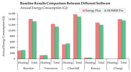 Figure 6 shows the results obtained using different software for the baseline scenario in different climate zones. Maximum differences of 6% and 8% were obtained for the heating and net energy consumptions in Vancouver (BC), respectively. This confirmed the validity of the approaches followed in modeling.