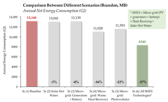 Table 5 reports the simulation results for the annual energy consumption of a 150-persons RTC in Brandon (MB) according to different scenarios: Baseline, Solar Hot Water, Microgrid: generators + battery, Microgrid with a Waste Heat Recovery (a counter-flow fluid heat exchanger), Microgrid with a PV array (100 kW PV system to cover peak electric loads excluding cooling), and the scenario with all SHES technologies integrated.