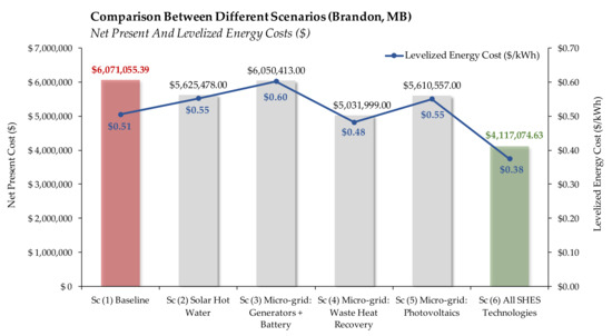 Results indicated that up to 32% reduction in net present value over current base camp configurations are achieved when all the SHES technologies are implemented for accommodating 150-person in a temperate climate (Brandon, MB) (Figure 8). The levelized cost of energy was also significantly reduced by 25%, as indicated. Figure 8 shows that the SHES acts as the most cost-effective solution; thus, it is the optimal solution that maximizes the use of renewable-generated energy while minimizing the project lifetime capital costs. More importantly, it is evident that the consideration of individual technologies eliminated the benefits gained from the integrated solution, and in fact, most technologies (except for WHRU), although reducing the net-present costs compared to the baseline, produced increased levelized energy costs due to their high initial costs and limited energy savings and utilization of all available energy resources when compared to SHES.