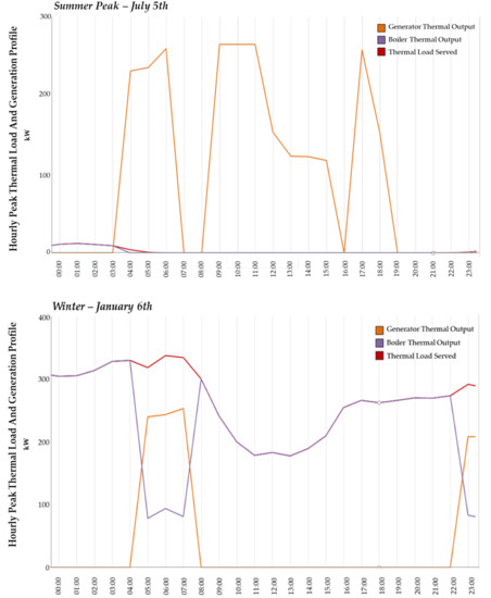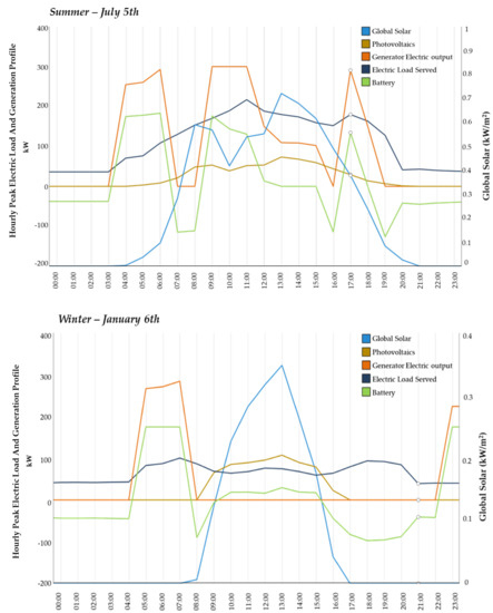 The results of the control strategy can be observed in Figure 10 and Figure 11, which show the electric and thermal and the generation profiles for the summer and winter peak demand days, respectively. The electric load served is initially constant and relatively low during early and late hours of the summer days and in the absence of solar radiation (Figure 10). Thus, this low electric load is satisfied solely by the energy stored in the battery while the generators are off. As the electric load starts to increase, the generators are turned on to satisfy parts of these loads, while the remaining parts are satisfied using the PV-generated power. To reduce the generator runtimes, at several intervals of the day, the reliance of the generator is reduced and eventually eliminated. At the same time, the loads are still being served by the energy stored in the battery during the previous hours. For the winter day, similar trends can be seen. However, due to lower electrical loads and increased PV generation as a result of a lower sun altitude, after the generators are turned on to serve partial loads and charge the battery, they are turned off for extended periods of the day, thus significantly reducing fuel consumption by relying on renewable resources. The generator’s runtime was reduced considerably to 4600 h (48% reduction) compared to 8760 h for the baseline configuration. It is also evident that the system could benefit from a greater PV size due to the high availability of solar radiation that is not being taken advantage of in both summer and winter months.