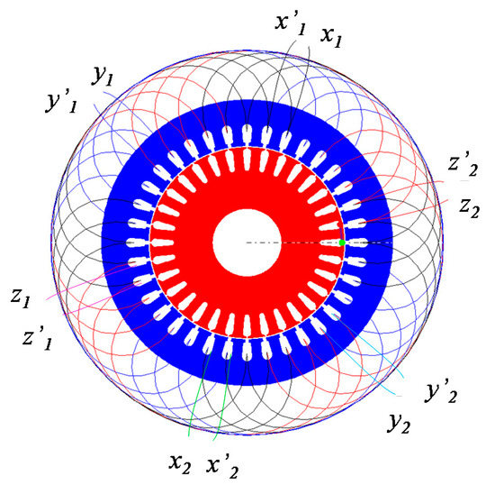 The layout of the windings in the motor affects not only the magnetomotive force (MMF) distribution and the motor performance, but also the torque ripple reduction using the proposed skill. In practice, the motor’s windings are formed by wire-wound coils of one or more turns placed in slots arranged to form either single-layer or double-layer windings [24]. The double-layer windings [24] through six-phase currents can result in a better sinusoidal back electromotive force (EMF) waveform than the single-layer windings [24]. The double-layer winding design with regard to the fundamental winding factor that adopts lap windings and concentric windings is used in this paper. The fundamental winding factor is 0.942 for lap windings and 0.932 for concentric windings in the template test. The fundamental winding factor thus adopts 0.942 for lap windings to raise the back electromotive force in this paper. The induced back EMF from double-layer windings with 0.942 for lap windings results in a better sinusoidal waveform so that the vibrated noise will be obviously cut down.
