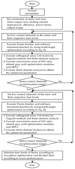 Six-phase induction motors [1,2,3] have been used in many domains of electrical power plants, consumer markets, and so on. The six-phase induction motor provides lower torque ripple, better reliability, and higher efficiency for its size compared to the traditional three-phase induction motor [4]. Therefore, there are many optimal design methods and applications for aluminum rotor induction motors [5,6] and copper squirrel cage rotor induction motors [7,8,9,10,11,12,13]. Cunkas et al. [5] proposed an optimal design method to optimize the three-phase aluminum squirrel cage rotor induction motor for optimization of torque, efficiency, and cost by using a genetic algorithm. Sun et al. [6] proposed a bearingless induction motor design with an outer rotor and applied this design in flywheel energy storage systems. Parasiliti and Villani [7] proposed the use of a copper cage in three-phase low-voltage induction motors and a design guideline to optimize efficiency according to the new European classification scheme. Daut et al. [8] investigated the efficiency of a die-cast copper rotor cage induction motor with a H10 non-grain oriented electrical steel sheet as lamination. Kane [9] proposed the use of a copper cage rotor induction motor with higher torque for assisting in engine cranking and peak power mode. Zhang et al. [10] proposed the design and evaluation of a die-cast copper squirrel cage rotor induction motor applied in traction drive by using a 2D finite element model. Moreover, technologies using multi-objective optimization design [11,12,13] are fashionable design skills in a lot of industrial appliances. Mittelstedt et al. [11] proposed optimal designs of composite multi-rim flywheel rotors by using the multi-objective optimization skill. Anwar et al. [12] proposed hybrid bio-inspired meta-heuristic multi-objective optimization in a cloud computing environment by using the optimized multi-objective scheduling of scientific workflows. Shen et al. [13] proposed the optimization of a forecasting model by using an improved multi-objective artificial bee colony algorithm combining multi-objective evolutionary knowledge. However, these multi-objective optimization designs [11,12,13] combined with the other optimized skills resulted in slower convergent speed because of taking more search time to find optimum values.