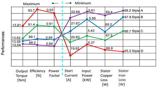Table 6 lists some comparisons of the machine performance with MPCI and multi-high performance indices from Table 2, Table 3, Table 4 and Table 5 and Figure 5 to choose four kinds of styles with better performances as follows. Regarding the smallest summations in the minimization of stator iron loss, stator copper loss, starting current, and input power at the first-phase optimization according to Table 2 and Table 3, and Figure 3, the smallest summations sorted from small to large for the four kinds of styles are No. 8, 10, 3, and 15 in Table 2 and Table 3. Then, regarding the MPCI values in Figure 3 from Table 2 and Table 3, the smallest combination of design parameters in the stator part of the SCSCRIM design with the minimization combination as (A2B4C3D2E1), with regard to No. 8 in Table 2 and Table 3, can be found as Style D. Secondly, Style C is No. 10 in Table 2 and Table 3 from Figure 3. Thirdly, Style B is No. 3 in Table 2 and Table 3 from Figure 3. Fourth, Style A is No. 15 in Table 2 and Table 3 from Figure 3. Furthermore, regarding the largest summations in the maximization of the output torque, the output power, and the power factor at the second-phase optimization according to Table 4 and Table 5, and Figure 4, the largest summations sorted from large to small for the four kinds of styles are No. 8, 10, 3 and 15 in Table 2 and Table 3. Then, regarding the MPCI values in Figure 4 from Table 4 and Table 5, the largest combination of design parameters in the rotor part of the SCSCRIM design with the maximization combination as (a3b2c4d3e1), with regard to No. 10 in Table 4 and Table 5, can be found as Style D. Secondly, Style C is No. 8 in Table 4 and Table 5 from Figure 4. Thirdly, Style B is No. 3 in Table 4 and Table 5 from Figure 4. Fourth, Style A is No. 15 in Table 4 and Table 5 from Figure 4. Table 6 shows four kinds of SCSCRIM configurations with better performances as Styles D, C, B, and A from best, better, good, to general according to the above-mentioned skill. Comparing all performances for the four kinds of SCSCRIM configurations shown in Table 6, Style D of SCSCRIM is chosen as the best performance in the two-phase high-performance design with multi-objective optimization. Figure 5 shows the poly-line graph of several kinds of performances for stator iron loss, stator copper loss, starting current, input power, efficiency, power factor, and output torque in the four kinds of SCSCRIM configurations from Table 6.