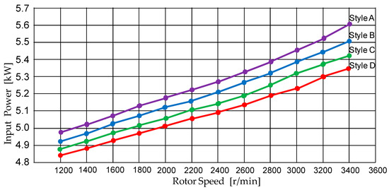 Poly-line graph of input power for four kinds of SCSCRIMs under several speeds.