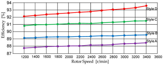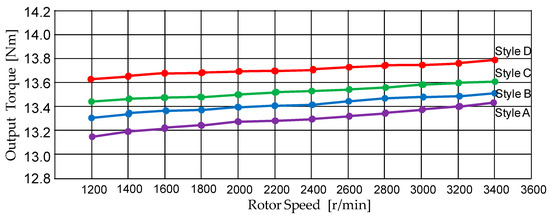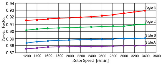 Furthermore, poly-line graphs from performance tests on stator copper loss, stator iron loss, starting current, input power, efficiency, power factor, and output torque for the four kinds of SCSCRIMs under several speeds via simulated results are shown in Figure 6, Figure 7, Figure 8, Figure 9, Figure 10, Figure 11 and Figure 12, respectively. In summary, it is seen that the two-phase high-performance design with multi-objective optimization can reduce stator copper loss, stator iron loss, starting current, and input power from the performance tests shown in Figure 6, Figure 7, Figure 8 and Figure 9, and it can raise efficiency, power factor, and output torque from the performance tests shown in Figure 10, Figure 11 and Figure 12 via simulated results. It is very obvious that many characteristic performances in Style D of SCSCRIM are superior to Styles A, B, and C through the high-performance design with multi-objective optimization by use of altered grey wolf optimization, the Taguchi method and FEA.