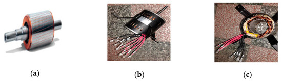 Photo pictures of a SCSCRIM in Style D: (a) copper squirrel cage rotor; (b) combination of stator, rotor and six windings; (c) full cross of stator and six windings.