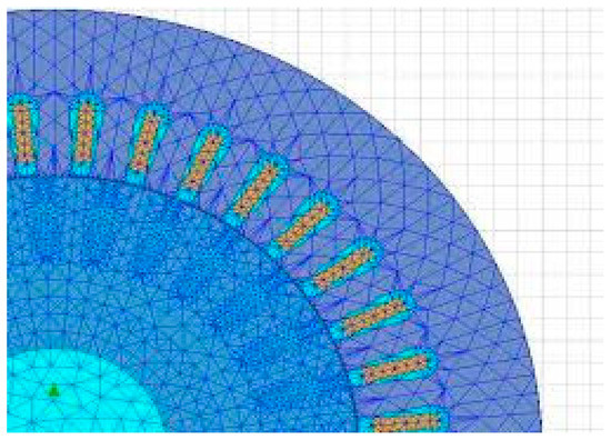 Finally, according to the proposed skill, Style D of SCSCRIM has completed the manufacturing body. Photo pictures of Style D of SCSCRIM are shown in Figure 13. The view of (a) the copper rotor; (b) the combination of stator, rotor and winding; and (c) the full cross of stator and six windings in Style D of SCSCRIM is shown in Figure 13a–c. A mesh plot of a SCSCRIM using the FEA method with quarter cross in Style D is shown in Figure 14. The flux density distribution of a SCSCRIM with full cross in Style D using the FEA method is shown in Figure 15.