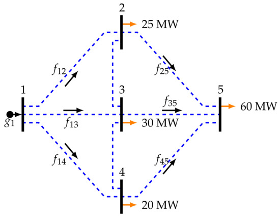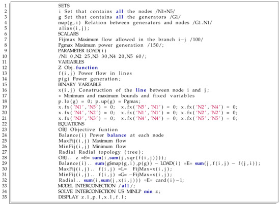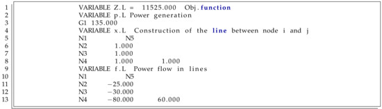 Note that the objective function reaches an optimum value of about 11525 MW, and this system has building lines , , , and with the following power flows: MW, MW, MW, and MW (this is the same solution reported in [48] using the AMPL software). In addition, the remainder of variables is zero, which implies that this is the optimal solution of the model since it fulfills all the constraints in the mathematical model Equations (13a)–(13g) used in this example to present the main characteristics of any mathematical optimization via the GAMS package. For more details about the software, please refer to [46,47].