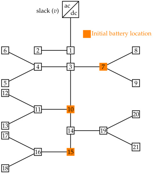 The 21-node test system is a radial test feeder composed of 21 nodes and 20 branches in radial connection, where the slack node is located at node 1. The configuration of this dc network is presented in Figure 6.