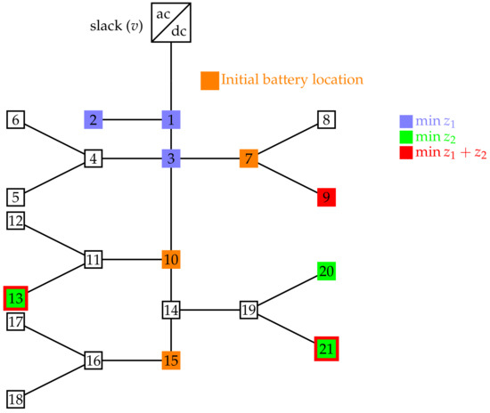 - The location or reallocation of the batteries in the dc grid will depend on the performance indicator, i.e., objective functions and , even if they are used independently or as a linear combination.