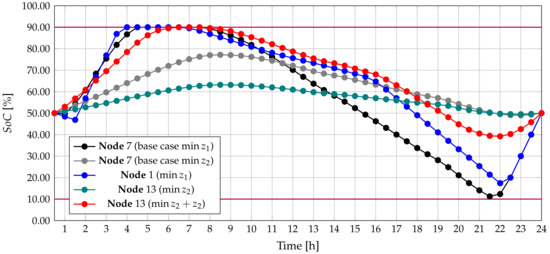 To understand whether the reallocation of the batteries satisfy the operative conditions imposed on the mathematical model, i.e., begin and end the day with considering possible variations between and , Figure 8 presents the behaviors for both base cases and the three possible locations, reported in Table 6 for the battery type 1.