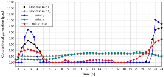 - When the objective function is the linear combination of and , i.e., , the objective function is COP$/day 1,282,580.07; this implies an increment regarding the base of the case of the energy purchase about COP$/day 11,857.37 per day of operation. In the case of daily energy losses reduction, the linear combination reaches a reduction of COP$/day 711,772.85 per day of operation.