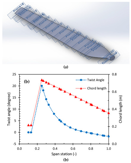 The blade geometry was created using SolidWorks [27] and disregarded the effect of the tower and nacelle to reduce computational time and enhance numerical stability [28]. The wind blade consisted of 18 sections as shown in Figure 1a. These sections had different twist angles and chord lengths along the blade as shown in Figure 1b. The geometry of the cylindrical part ended at 0.66 m from the axis of rotation and then started to change until the transition area ended at 1.25 m. From Figure 1b, the maximum twist angle reached 20.040° at 0.25 span and later became zero at a 0.75 span and a negative value at a 1.00 span.