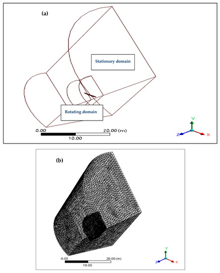 The fluid domain was divided into two zones as shown in Figure 2a. The first zone with a 120° radial stream tube was generated with periodic faces to decrease computational time due to the symmetrical flow around the wind turbine model. The upstream velocity was specified with an 18 m radius, offset 12 m in front of the blade. Meanwhile, the downstream outlet was defined with a 36 m radius, offset 24 m behind the blade, and specified as an atmospheric pressure outlet. The second zone was near the blade with a 10 m radius and 5 m from the center of the root. This zone was created to separate the rotating and stationary zones and to increase the number of mesh cells near the blade. The upstream velocity and upper surface of the domain were specified as free stream wind speed. This conical shape of the domain was used to permit wake conical expansion on the back of the blade. An important step is choosing the most suitable computational domain. First of all, a proper computational domain that permits rotation of the wind turbine blade with a no-slip wall effect is essential when considering the optimization of mesh quality. Consequently, a large computational domain will not permit enough grid generation around the wind turbine. On the other hand, a vast domain would increase the computational time corresponding with an increase in the calculated number of cells.