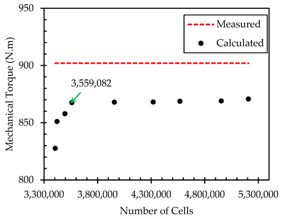 Also, he proximity and curvature with the fine relevance center were defined as the specification of the local mesh size function which helped to refine the mesh grid. Mesh quality plays a crucial role in the accuracy of CFD results. However, a smaller mesh size requires a longer computation time and more computer memory. For this reason, it is essential to compromise between accuracy and computational time. On the other hand, it is crucial to achieve mesh independence. Nine meshes were tested at a 7.2 m/s wind speed to achieve grid independence by monitoring the mechanical torque. As shown in Figure 3, the CFD results converged when the number of mesh cells was 3,559,082, which had an error rate of 3.82% when compared with the measurement value. Any further increase in the number of mesh cells will significantly raise the computational time but will lead to no improvement in the accuracy. For this reason, 3,559,082 mesh cells is deemed to be the most suitable mesh configuration in terms of computational time and efficiency.