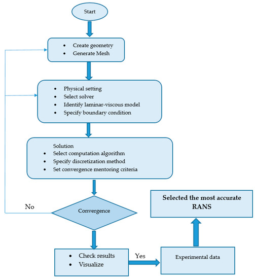 In the simulation process (Figure 4), it is essential to monitor the convergence of the simulation analysis. In this study, two methods were used to assess the convergence of the fluent analysis. Firstly, the residual values method is a popular method for evaluating the convergence of the CFD solution. In this study, during the calculation process, different variables of the residual values were monitored such as continuity, x-velocity, y-velocity, z-velocity, specific dissipation rate, and turbulent kinetic energy. The solution was considered to be converged when these residual values were below 10−5. Secondly, a net mass imbalance was used to check the convergence of the solution. This method is the difference between the inlet and outlet mass flows. It was considered to be converged when the net mass imbalance was less than 0.001 kg/s [31].